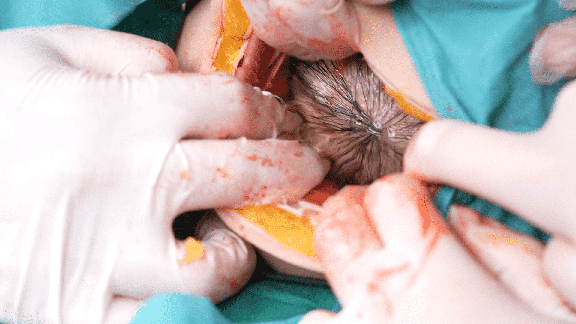amniotic membrane and other structures. Realistic palpation with a fetus inside the abdomen. Cutting, blunt separation, capillary bleeding with tissue incision, cesarean