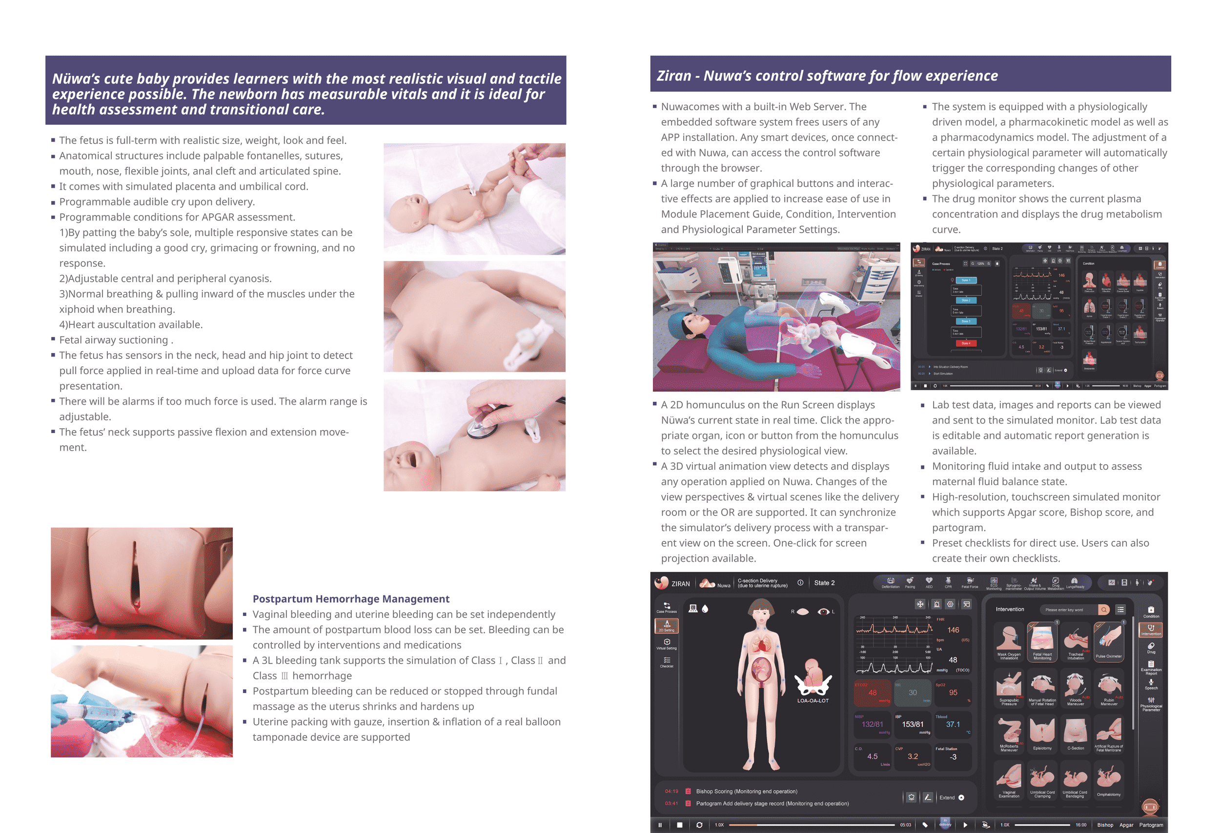 Nuwa comes with postpartum hemorrhage module to simulate severe bleeding caused by postpartum uterine atony.