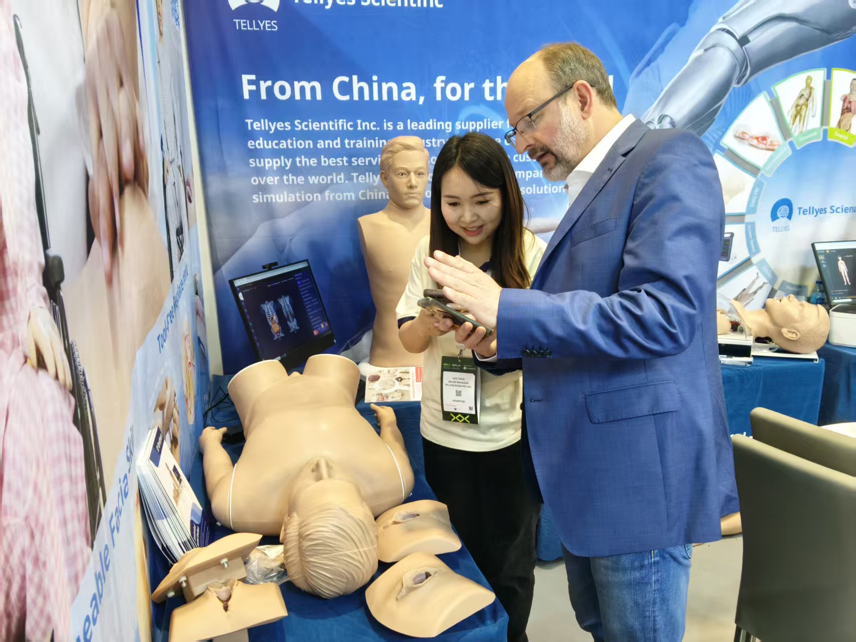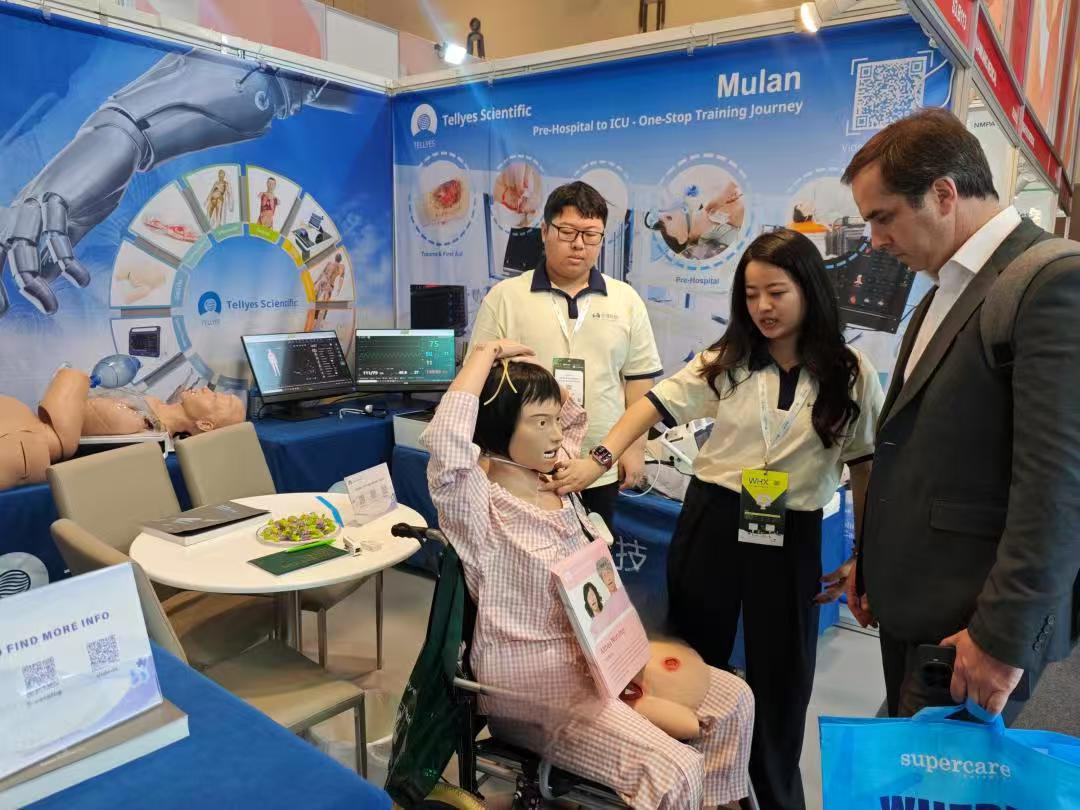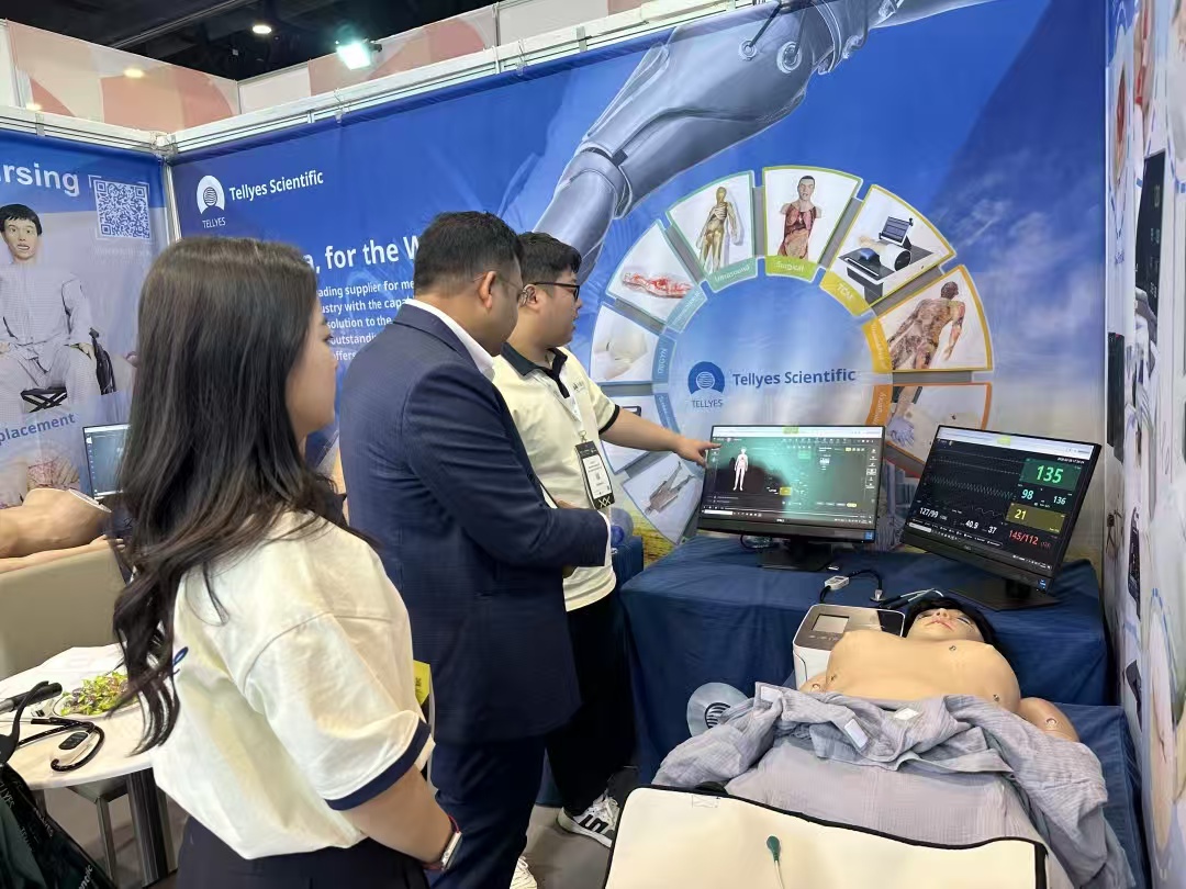 Tellyes team made a splendid appearance at Booth S3.B113, showcasing a range of high-end intelligent simulators including MULAN-Multifunction Patient Simulator, Althea Nursing, SP Brothers-Standardized Patient Brothers, Complete Childbirth Simulator (Twins), and DefibReady. On the very first day, our booth attracted over a hundred experts from more than 40 countries and regions for visits and hands-on experiences.