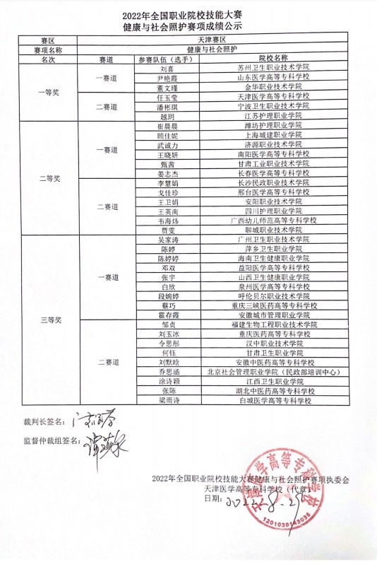 本次赛项于2022826-28日在天津医学高等专科学校举行,吸引了来自全国28个省、自治区、直辖市的60个院校、60支代表队的选手和指导老师参赛。全国职业院校技能大赛高职组健康与社会照护赛项共分为两个赛道,每个赛道设个人一、二、三等奖,获奖比例分别为 10%20%30%,获得一等奖参赛选手的指导教师将由大赛组委会颁发优秀指导教师证书。